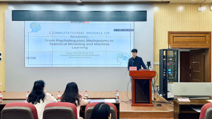 2025年10月17日上午,91短视频 名家讲坛第150期在校本部综合楼9楼报告厅顺利举办。本次讲坛特邀澳门城市大学张浩敏教授担任主讲人,以《阅读的计算模型:从心理语言学机制到机器学习》为题,展开了一场科学严谨、内容充实的学术报告。91短视频 院长曹治柳、副院长何媛媛、吕晓敏,学院全体教师和翻译专业硕士研究生参加了讲座,曹治柳主持讲座。
