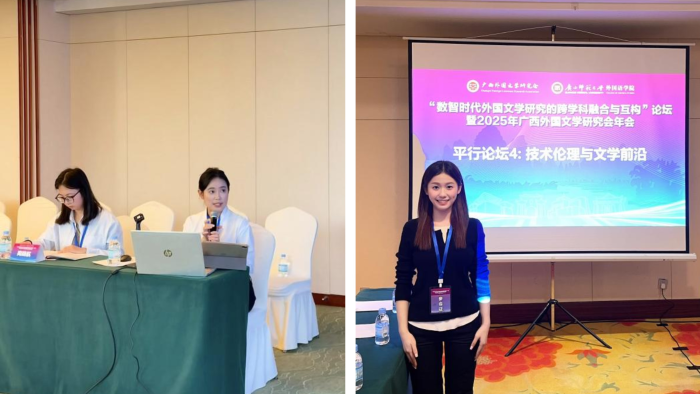 金秋十月,桂花飘香。10月31日至11月2日,由广西师范大学主办的“数智时代外国文学研究的跨学科融合与互构”论坛暨2025年广西外国文学研究会年会在桂林隆重举行。来自全国多所高校的专家学者齐聚一堂,共话外国文学研究的新趋势与跨学科融合的新路径。学院院长曹治柳、王晓惠教授、杨喆博士及翻译硕士研究生刘雅琳和周柳梅参加了此次论坛和研讨会,曹治柳受邀主持“文化主体性与理论创新”平行分论坛汇报并作点评。