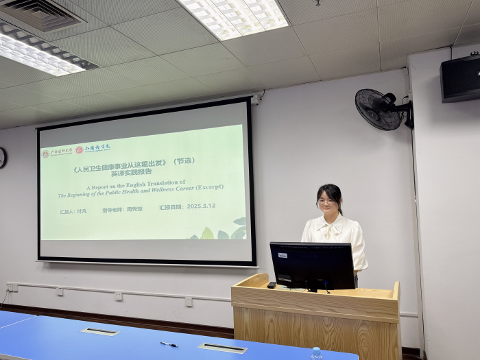 23级翻译专业的两名硕士研究生叶凡和梁柳献进行了汇报。叶凡以“《人民卫生健康事业从这里出发》(节选)英译实践报告”为主题,充分利用Trados和AI等辅助工具,在文化翻译观指导下完成翻译实践报告。院长周秀琼作为本期主要点评硕导,她肯定了翻译实践报告的清晰思路以及红医文化的探究价值,提出了在翻译过程中要注重意识形态、挖掘更深层次文化等建议,以确保论文的政治正确和严谨性。梁柳献在获得出版社试译资格后,以“《叙事之心》医学隐喻英汉翻译实践报告”为题,结合归化策略、直译和意译等翻译方法,系统性分析整理源文本中的特殊隐喻现象—博喻。硕导蓝岚教授在点评时肯定了梁柳献对源语书籍受众的分析解读,考虑读者感受,帮助读者深刻地理解源语文化背景,提出了深入案例分析、加强译后审校等建议,以增强论文的深度和准确性。在场的硕导们给出深入且有益的修改意见。